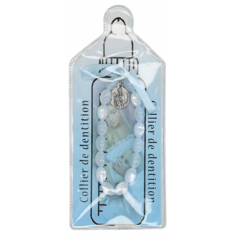 Ce bijou est traditionnellement offert aux bébés pour apaiser le mal de dents. Il existe en plusieurs coloris, dans ce cas en bleu pour les petits garçons. Le collier de dentition est accompagné d’une prière écrite en français et d’une médaille en métal argenté de Sainte Apolline. Sainte Apolline est priée pour le mal de dents. Le tout est joliment présenté dans une pochette en forme de biberon.