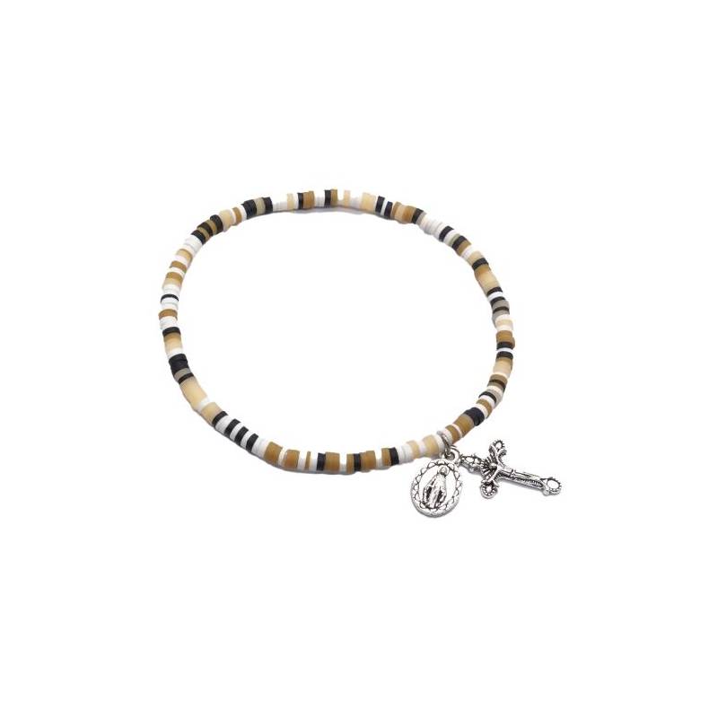 Armband op elastiek met bruine korrels + medaille and kruisje