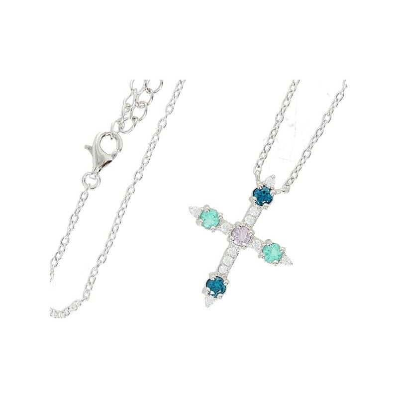 Kruis in zilver met rhodium + veelkleurige zirkonen 20 x 18 mm + ketting